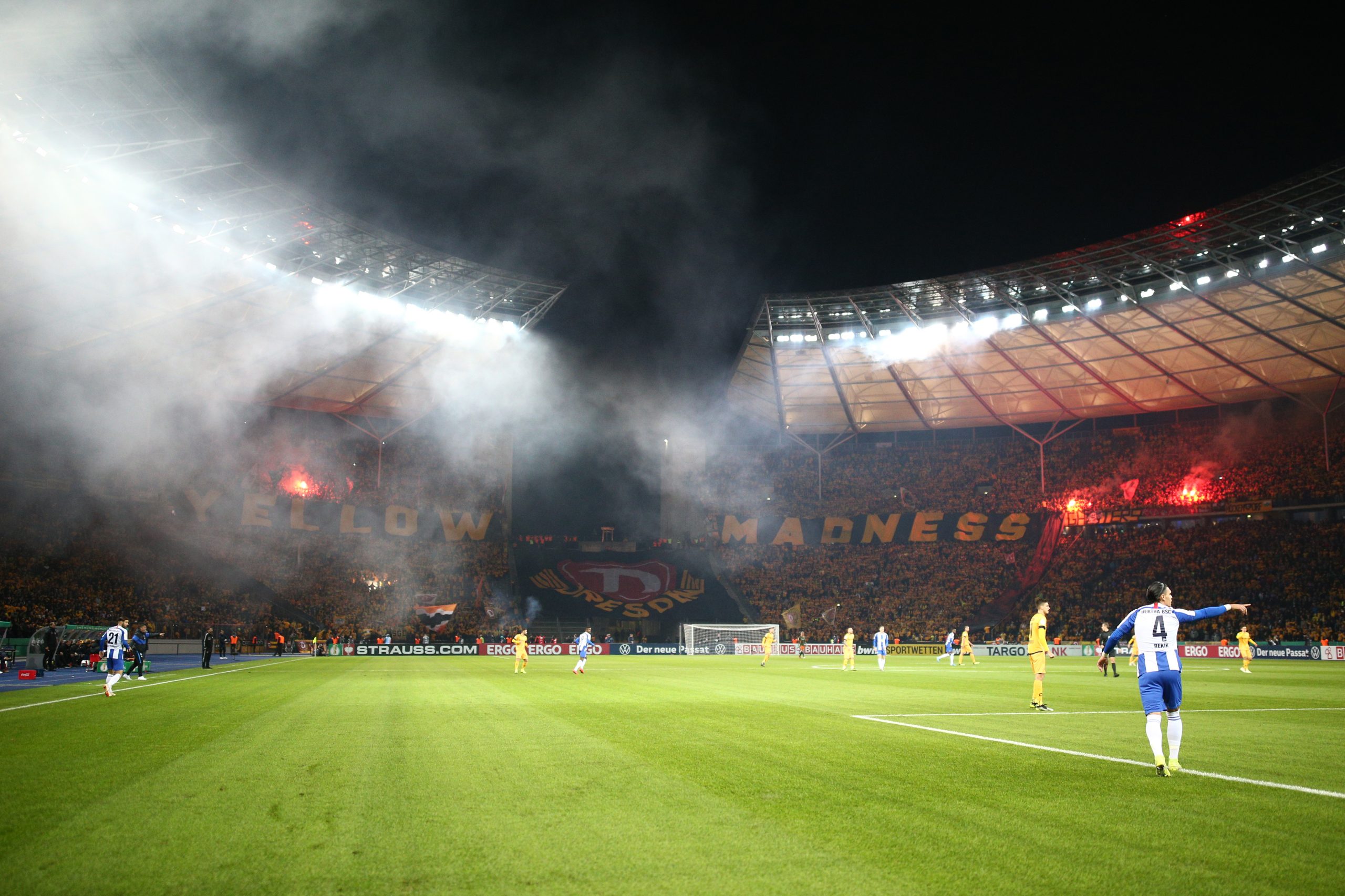 Damals war nicht nur der Gästeblock, sondern auch große Teile des Heimbereichs in Gelb gefärbt. Das soll diesmal vermieden werden: Dresdner Fans haben keinen Zugang zu den Heimbereichen. Die Berliner Polizei bereitet sich daher auf ein Hochrisikospiel vor. Zudem brisant: Erstmals seit Langem spielen Union Berlin und Hertha BSC gleichzeitig in der Hauptstadt.