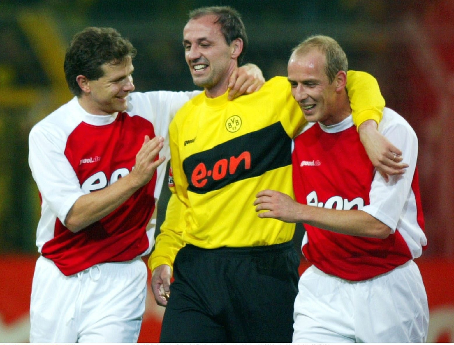Titel und Sprüche: Der legendäre ,,Fußballgott" Jürgen Kohler (m.) 2002 in seinem Abschiedsspiel in Dortmund, mit seinen Weggefährten Andreas Möller (l.) und Mario Basler. Foto: Martin Rose/Bongarts/Getty Images
