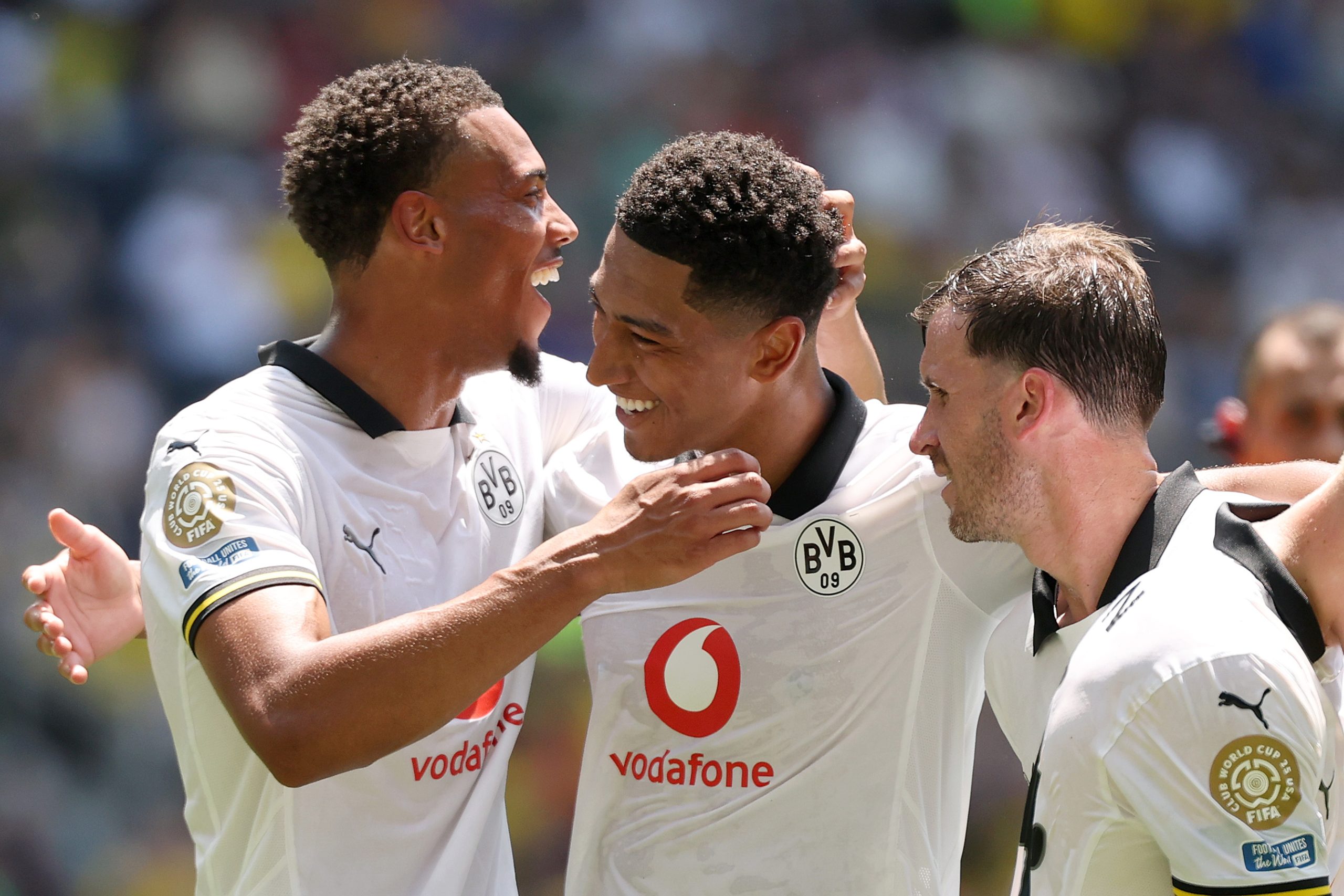 CINCINNATI, OHIO - JUNE 21: Jobe Bellingham #77 of Borussia Dortmund celebrates with teammates after scoring a goal during the FIFA Club World Cup 2025 group F match between Mamelodi Sundowns FC and Borussia Dortmund at TQL Stadium on June 21, 2025 in Cincinnati, Ohio. (Photo by Michael Reaves/Getty Images)