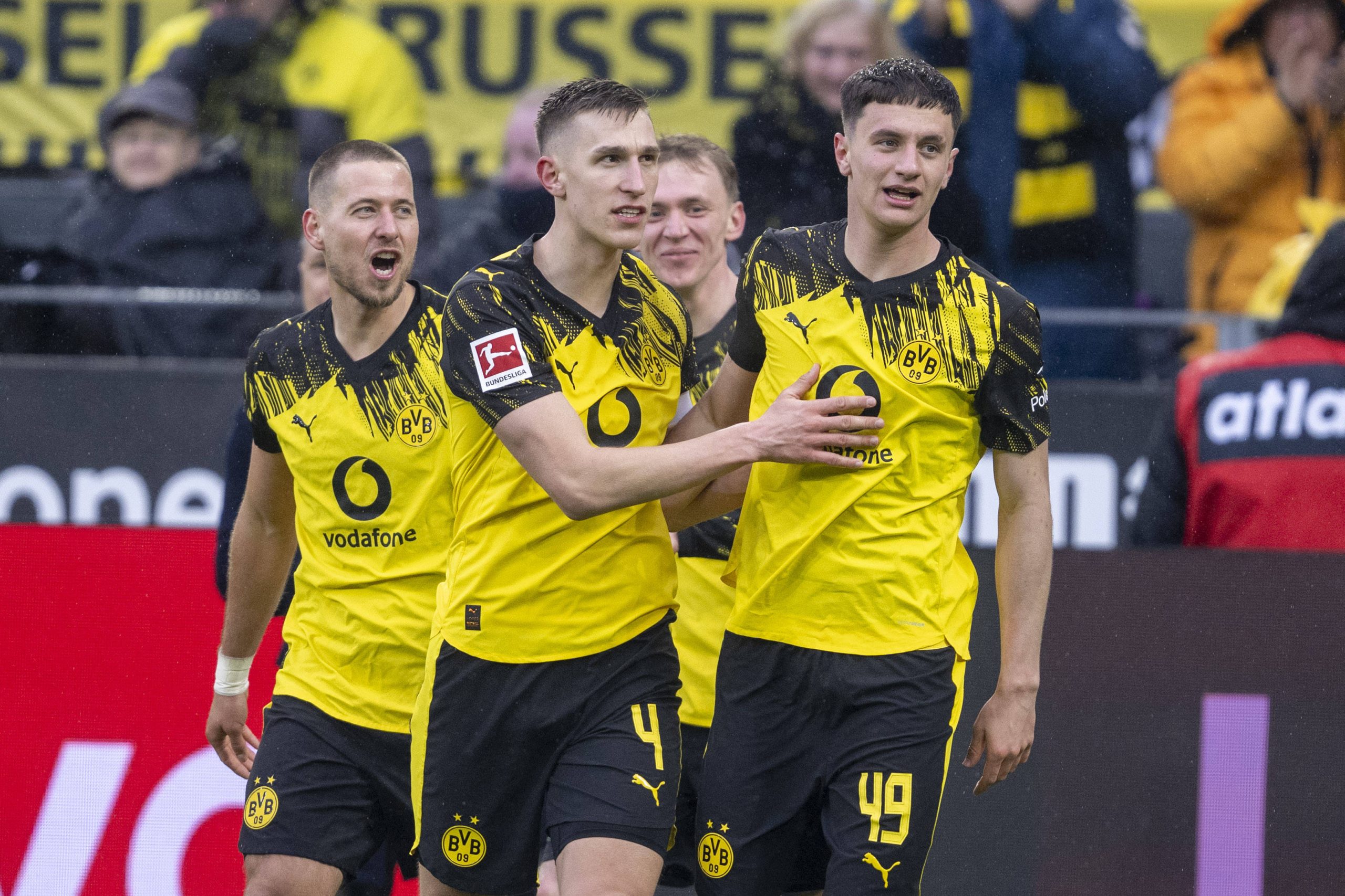 14.03.2026: Fußball: Borussia Dortmund - FC Augsburg, 26. Spieltag im Signal-Iduna-Park. Nico Schlotterbeck Borussia Dortmund l-r und Waldemar Anton Borussia Dortmund jubelt mit Luca Reggiani Borussia Dortmund nach dem Tor zum 2:0. WICHTIGER HINWEIS: Gemäß den Vorgaben der DFL und des DFB ist es untersagt, in dem Stadion und/oder vom Spiel angefertigte Fotoaufnahmen in Form von Sequenzbildern und/oder videoähnlichen Fotostrecken zu verwerten bzw. verwerten zu lassen. *** 14 03 2026 Football Borussia Dortmund FC Augsburg, Matchday 26 at Signal Iduna Park Nico Schlotterbeck Borussia Dortmund l r and Waldemar Anton Borussia Dortmund cheering with Luca Reggiani Borussia Dortmund after the 2-0 goal IMPORTANT NOTE In accordance with the regulations of the DFL and the DFB, it is prohibited to use or have used photographs taken in the stadium and / or of the match in the form of sequential images and / or video-like photo series Copyright: xDavidxInderliedx/Imago-Images