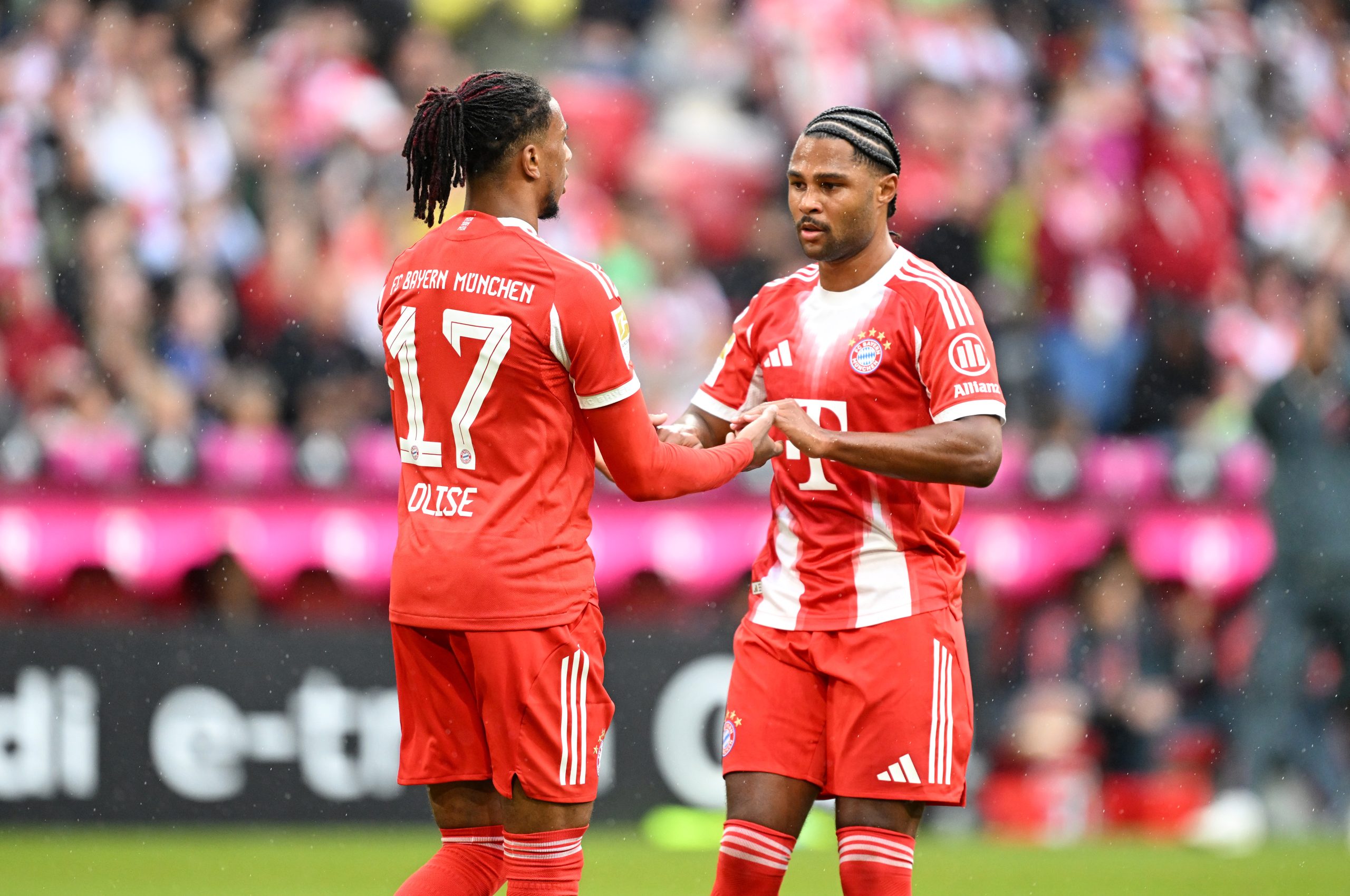 MUNICH, GERMANY - AUGUST 02: Michael Olise of Bayern Munich celebrates scoring his team's second goal with teammate Serge Gnabry during the pre-season friendly match between FC Bayern München and Olympique Lyonnais at Allianz Arena on August 02, 2025 in Munich, Germany. (Photo by Christian Kaspar-Bartke/Getty Images)