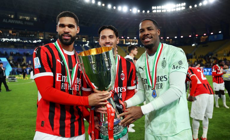 RIYADH, SAUDI ARABIA - JANUARY 06: Ruben Loftus-Cheek, Tijjani Reijnders and Mike Maignan of AC Milan celebrate with the Italian Super Cup Trophy after the team's victory in