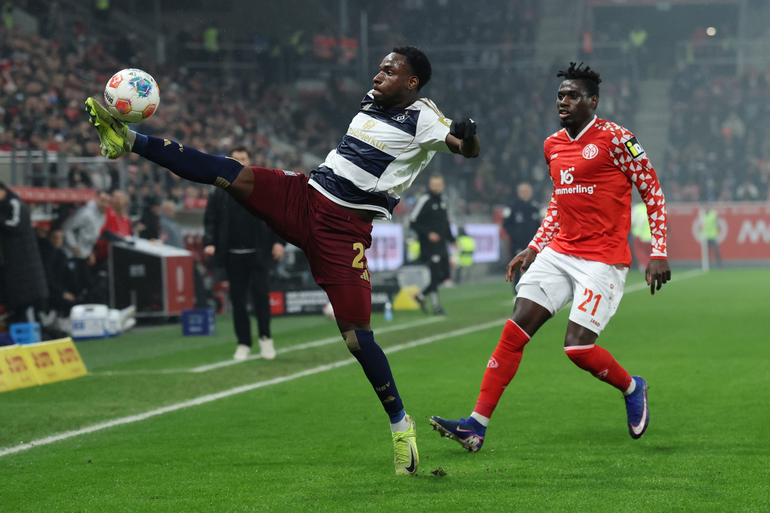 MAINZ, GERMANY - FEBRUARY 20: Philipas Otele of Hamburger SV is challenged by Danny da Costa of 1. FSV Mainz 05 during the Bundesliga match between 1. FSV Mainz 05 and Hamburger SV at MEWA Arena on February 20, 2026 in Mainz, Germany. (Photo by Alex Grimm/Getty Images)