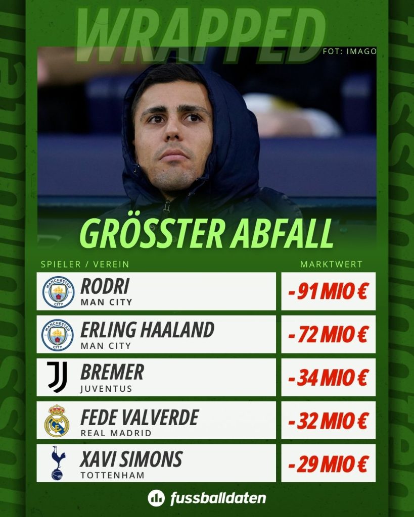 Nun zum anderen Ende der Tabelle. Die größten Rückgänge in Europa führt Rodri von Manchester City an: Sein Marktwert sank um 91 Millionen Euro. Hier ist der Grund klar – eine langwierige Verletzung des spanischen Mittelfeldstars.