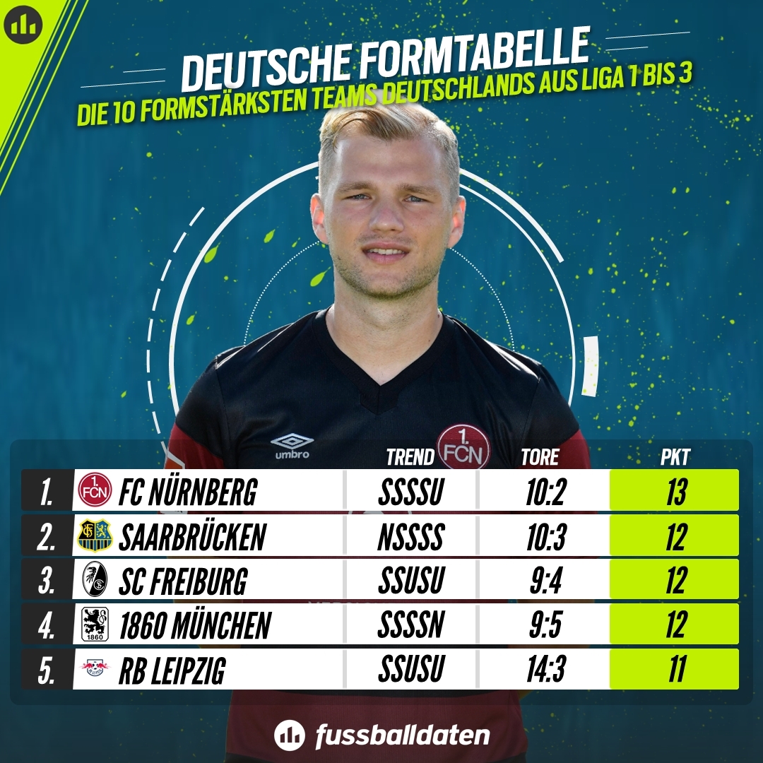 Das deutsche True-Form-Ranking hat einen neuen Spitzenreiter: Den 1. FC Nürnberg. Und das trotz eines 1:1 (1:1)-Heimremis gegen Dynamo Dresden, mit dem am vergangenen Samstag eine Serie von 4 Siegen am Stück zu Ende ging. „Wir haben angefangen nachzudenken – und das hat sich bis zur Schlussphase durch die zweite Hälfte gezogen“, kritisierte FCN-Coach Robert Klauß anschließend den Chancenwucher gegen die Dresdner. Bei Nürnbergs Torhüter Christian Mathenia überwog hingegen die Freude: „Das ist das erste Mal, seit ich beim Club bin, dass wir so eine Runde spielen.“ Die Nürnberger dürfen sich auf Platz 5 der Zweitliga-Tabelle noch Aufstiegschancen ausrechnen.