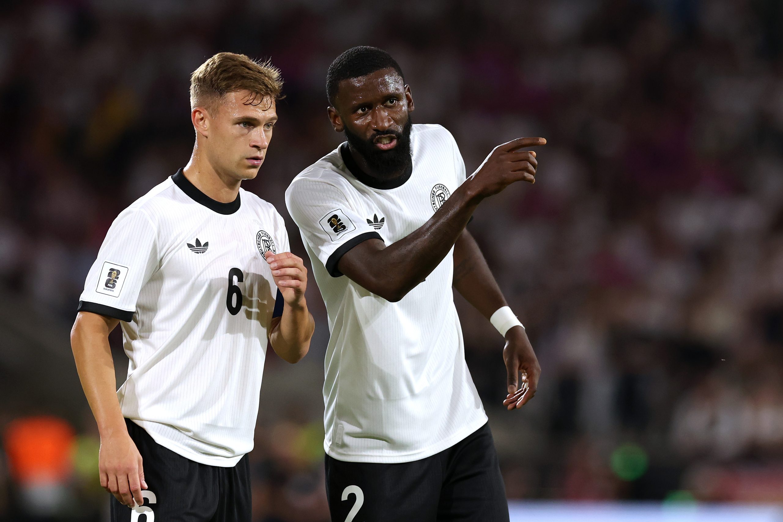 COLOGNE, GERMANY - SEPTEMBER 07: Antonio Rüdiger of Germany talks to his team mate Joshua Kimmich during the FIFA World Cup 2026 qualifier match between Germany and Northern Ireland at RheinEnergieStadion on September 07, 2025 in Cologne, Germany. (Photo by Alexander Hassenstein/Getty Images for VW)