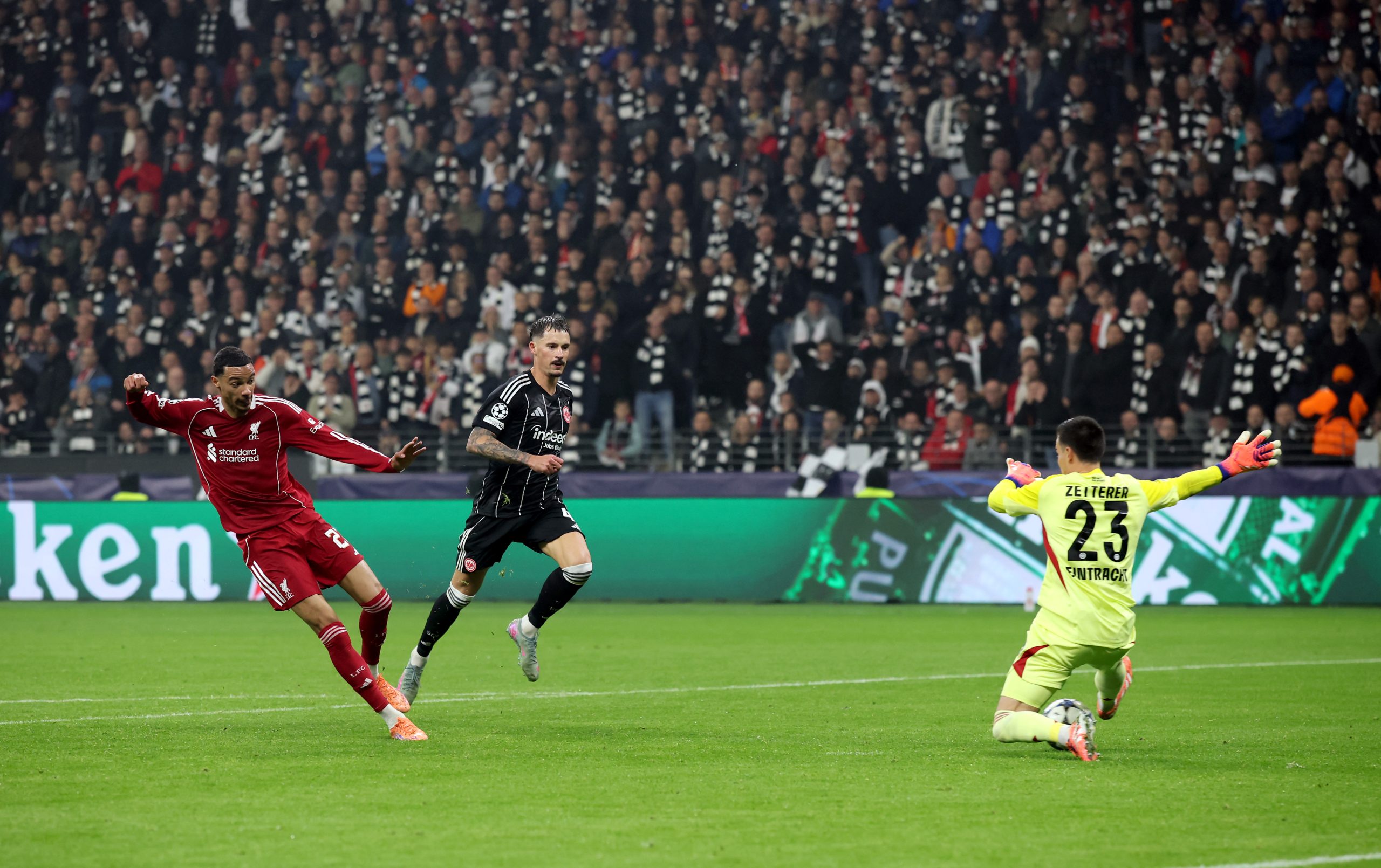 Hugo Ekitiké trifft am 22. Oktober 2025 für Liverpool gegen Eintracht Frankfurt in der Champions League - Sein Transfer brachte Eintracht Frankfurt einen geteilten Rekord-Betrag. Foto: Alex Grimm/Getty Images